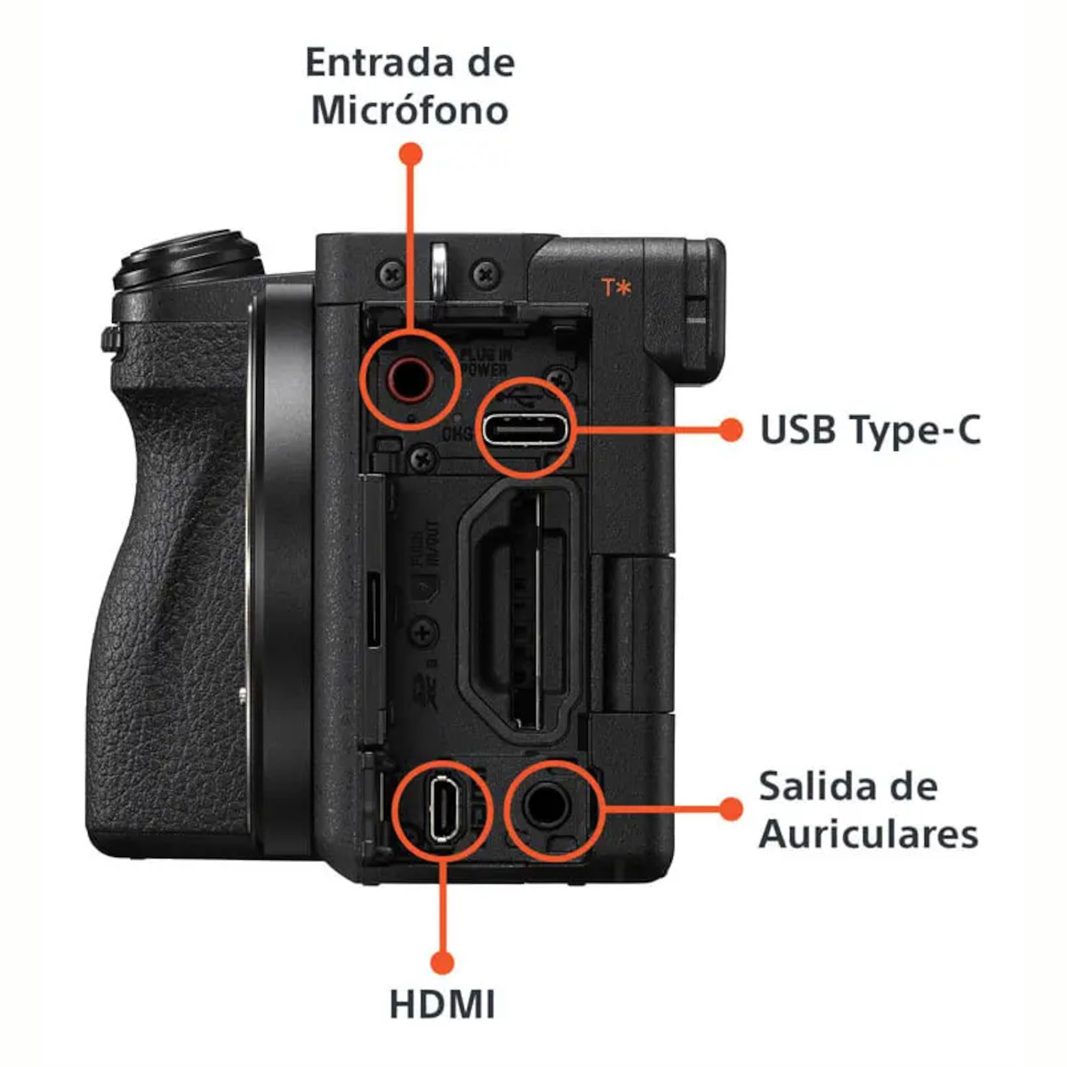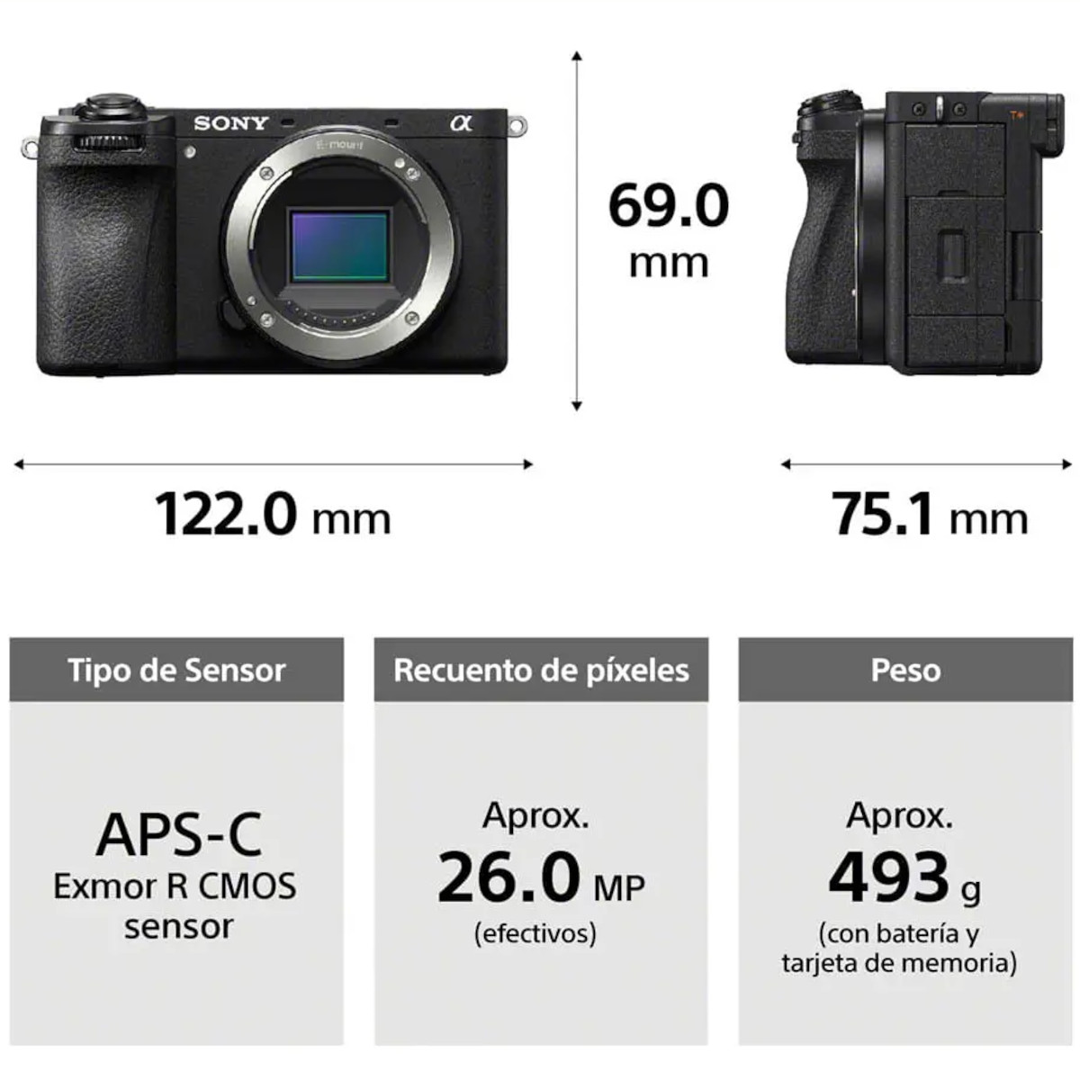 ESPECIFICACIONES » General TIPO DE CÁMARA: Cámara digital con objetivo intercambiable » Montura de lente: Montura E » TIPO DE SENSOR: Sensor Exmor R CMOS tipo APS-C (23,3 x 15,5 mm) » NÚMERO DE PÍXELES (TOTAL): Aprox. 27,0 megapíxeles » NÚMERO DE PÍXELES (EFECTIVOS): Fotografías: aprox. 26,0 megapíxeles máx.44, películas: aprox. 19,9 megapíxeles máx.45 » RANGO DE TEMPERATURA DE COLOR: 2.500 K a 9.900 K » Sistema antipolvo: Sí » TAMAÑO DE IMAGEN (PÍXELES) [3:2]: APS-C L: 6192 x 4128 (26 M), M: 4384 x 2920 (13 M), S: 3104 x 2064 (6.4 M) » MODOS DE CALIDAD DE IMAGEN: RAW, JPEG, HEIF (4:2:0/4:2:2), RAW y JPEG, RAW y HEIF » 14bit RAW: Sí » Formato de grabación: Sí » COMPRESIÓN DE VIDEO: XAVC S: MPEG-4 AVC/H.264, XAVC HS: MPEG-H HEVC/H.265 » FORMATO DE GRABACIÓN DE AUDIO: LPCM de 2 canales (48 kHz 16 bits), LPCM de 2 canales (48 kHz 24 bits)46, LPCM de 4 canales (48 kHz 24 bits)47 » CÁMARA LENTA Y RÁPIDA (FRECUENCIA DE IMAGEN DE CAPTURA): Sí » GRABACIÓN PROXY: Sí » TC/UB: Sí » Ranura de tarjeta de memoria: Ranura para tarjeta de memoria SD (compatible con UHS-I/II) » TIPO DE ENFOQUE: Enfoque automático híbrido rápido (enfoque automático con detección de fases/enfoque con detección de contraste) » RANGO DE SENSIBILIDAD DE ENFOQUE: EV-3 a EV20 (equivalente a ISO 100 con una lente F2,0 acoplada) » OBJETIVO DE RECONOCIMIENTO (FOTOGRAFÍAS): Humano, Animal, Ave, Insecto, Auto, Tren, Avión » OBJETIVO DE RECONOCIMIENTO (PELÍCULAS): Humano, Animal, Ave, Insecto, Auto, Tren, Avión » ILUMINADOR DE AF: Sí (con tipo LED incorporado) » TIPO DE MEDICIÓN: Medición evaluativa de 1200 zonas » SENSIBILIDAD DE MEDICIÓN: EV-3 a EV20 (equivalente a ISO 100 con una lente F2,0 acoplada) » COMPENSACIÓN DE EXPOSICIÓN: +/-5,0 EV (en pasos de 1/3 o 1/2 EV seleccionables) » CAPTURA ANTIPARPADEO.: Sí48 » TIPO: Visor electrónico XGA OLED de 1,0 cm (tipo 0,39) » Número de puntos: 2.359.296 puntos » Ampliación: Aprox. 1,07x (equivalente a cámaras de 35 mm: Aprox. 0,70x (con un lente de 50 mm a infinito, -1 m-1) » DIOPTRÍA: De -4,0 a +3,0 m-1 » Punto ocular: Aprox. 22 mm desde el lente de unidad óptica y 19.4 mm desde el marco de la unidad óptica a -1 m-1 (estándar CIPA) » Selección de frecuencia de imagen del visor: Modo NTSC: STD 60 fps/Alto 120 fps, Modo PAL: STD 50 fps/Alto 100 fps » Tipo de monitor: TFT de 7,5 cm (tipo 3.0) » PANEL TÁCTIL: Sí » Número de puntos: 1 036 800 puntos » Ángulo ajustable: Ángulo de apertura: Aprox. 176°, ángulo de rotación: Aprox. 270° » ZOOM DE IMAGEN NÍTIDA (FOTOGRAFÍAS): Aprox. 2x » ZOOM DE IMAGEN NÍTIDA (VÍDEOS): aprox. 1,5x (4K), aprox. 2x (HD) » Tipo de obturador: Obturador mecánico/Obturador electrónico » Sincronización de flash Velocidad: 1/160 s49 » Obturador de cortina electrónico delantero: SÍ (activado/desactivado) » MODO: Fotografías: Activado/desactivado, película: Activado/estándar/desactivado » CONTROL: Medición de flash TTL previa » COMPENSACIÓN DEL FLASH: +/-3,0 EV (permite elegir entre los pasos 1/3 y 1/2 EV) » Velocidad de conducción continua (máx. aprox.): Alto+: 11 fps50 » INTERFAZ DEL PC: Almacenamiento masivo/MTP » TERMINAL MULTI/MICRO USB: -58 » Zapata de interfaz múltiple: Sí (compatible con SuperSpeed USB de 5 Gbps [USB 3.2]) » RED DE ÁREA LOCAL INALÁMBRICA (INCORPORADA): Sí (compatible con Wi-Fi, IEEE 802.11a/b/g/n/ac [banda de 2,4 GHz/banda de 5 GHz])5960 » Bluetooth®: Sí (versión Bluetooth® estándar 4,2 [banda de 2,4 GHz]) » Zapata de interfaz múltiple: Sí (con interfaz de audio digital)61 » Terminal de micrófono: Sí (miniconector estéreo de 3,5 mm) » Terminal de audífonos: Sí (miniconector estéreo de 3,5 mm) » CONTROL REMOTO (INALÁMBRICO): Sí (control remoto Bluetooth®) » FUNCIONES: Enviar al smartphone, Control remoto mediante smartphone, PC remota » FORMATO DE DATOS DE VIDEO: MJPEG, YUV42062 » FORMATO DE DATOS DE AUDIO: LPCM de 2 canales (16 bits, 48 kHz) » Micrófono: Estéreo integrado » Parlante: Integrado, monoaural » CONFIGURACIÓN: Sombreado, Distorsión cromática; Distorsión, Variación de la longitud focal (películas) » BATERÍA SUMINISTRADA: Una batería recargable NP-FZ100 » Duración de la batería (CIPA, fotografía): 550 capturas aprox. (visor)/570 capturas aprox. (monitor LCD) (conforme a los estándares CIPA)63 » Duración de la batería (película, grabación real): Aprox. 95 min (visor)/aprox. 100 min (monitor LCD) (estándar CIPA) 64 » Duración de la batería (película, grabación continua): Aprox. 190 min (visor)/aprox. 185 min (monitor LCD) (estándar CIPA) » Carga de la batería interna: Sí (disponible con terminal USB Type-C, compatible con suministro de alimentación USB) » FUENTE DE ALIMENTACIÓN POR USB: Sí (disponible con terminal USB Type-C, compatible con suministro de alimentación USB) » SOLO CUERPO: Aprox. 409 g; aprox. 0 lb, 14.5 oz » TEMPERATURA DE FUNCIONAMIENTO: De 0 a 40 ? /de 32 a 104 °F