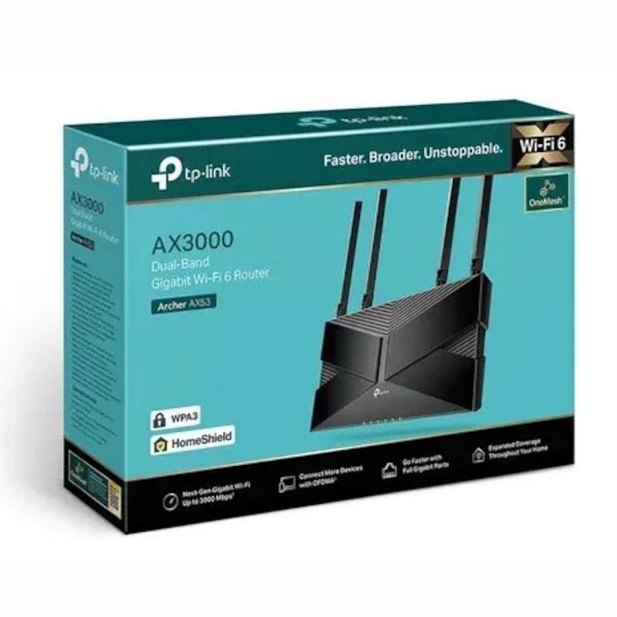 Router Tp-link Archer Ax53 Gigabit Wi-fi 6 Ax3000 One-mesh - Tecnología Wi-Fi 6 para mayor velocidad y eficiencia. - Velocidad total de hasta 3000 Mbps. - Cuatro puertos Gigabit Ethernet para conexiones por cable rápidas. - Compatible con OneMesh para crear una red Wi-Fi unificada. - Antenas externas para mejor cobertura y señal. - Ideal para streaming, juegos en línea y múltiples dispositivos conectados.