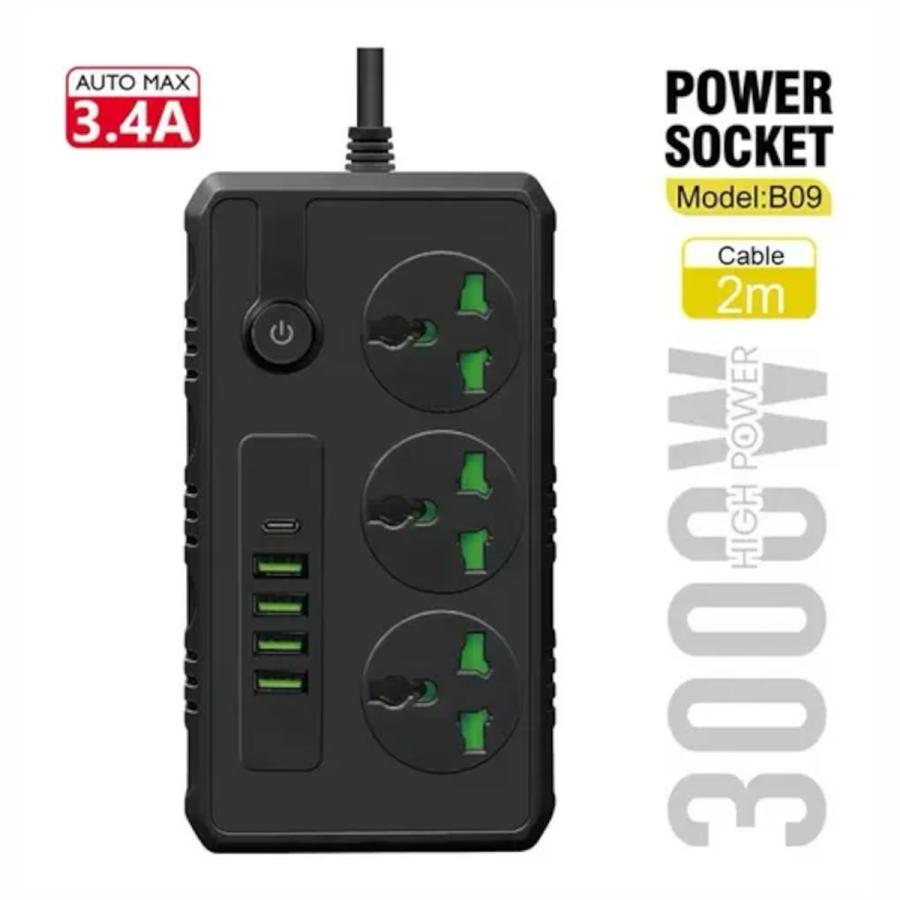 - Puertos: 3 tomas de corriente, 4 puertos USB y 1 puerto Tipo C.