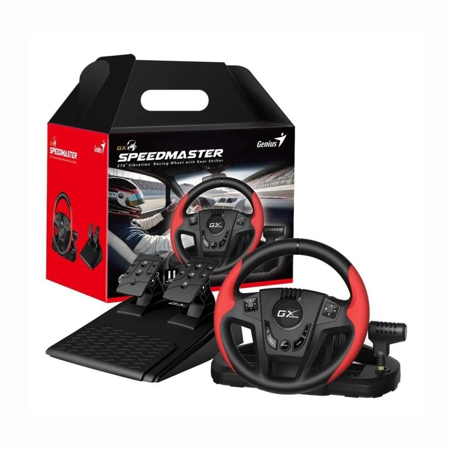 - Volante Genius SpeedMaster Gx Gaming Negro/Rojo El volante SpeedMaster ofrece un ángulo de rotación de hasta 270°, que se adapta a tus hábitos de conducción y proporciona así una experiencia de carrera fiel. Cuenta con una palanca de cambios secuencial, un motor de doble vibración, dos pedales y 13 botones de acción. Por supuesto, hay abrazaderas para fijar a la mesa. ESPECIFICACIONES BÁSICAS Interfaz: USB Ángulo de rotación: 270° Número de pedales: 2 Palanca de cambios: secuencial Compatibilidad: PC, PS3, PS4